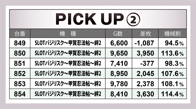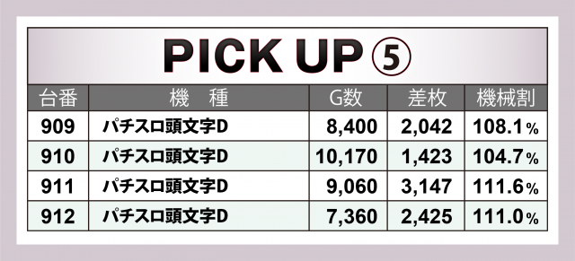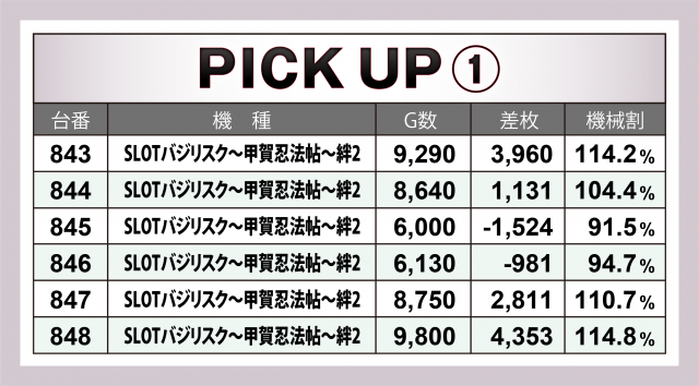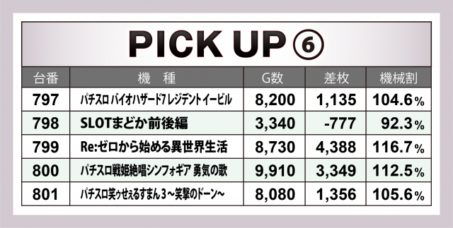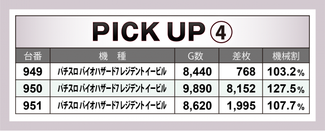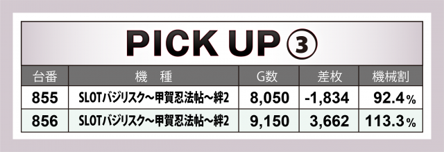 またこの日は横並び好況スポットが4か所で発生、特筆すべきは14台が対象となった『SLOTバジリスク~甲賀忍法帖~絆2』。マイナス台があったもののトータルで+1万4千枚超を達成。その他では、+8千枚達成台があった『パチスロ バイオハザード7 レジデント イービル』や4台全てがプラス&トータル+9千枚を超えた『パチスロ頭文字D』の好成績が目に付いた。