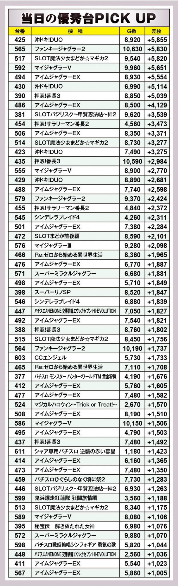 前回と同じく、実に様々な機種にてプラス値をマークしている台を確認。これはつまり、あらゆる機種にチャンスが潜んでいたことを意味する。その中で特筆すべきは完全告知マシン。『沖ドキ!DUO』『ファンキージャグラー2』『マイジャグラーⅤ』『アイムジャグラーEX』などから5,000枚オーバー記録が飛び出したのである。今回は完全告知マシンに座るが吉、だった…!?