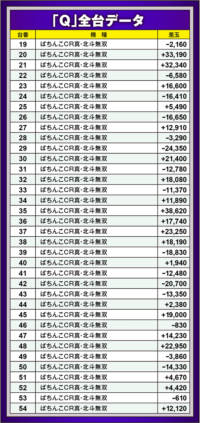 全36台を誇り、連日大盛況の『ぱちんこCR真・北斗無双』が、今回も大暴れ。上表をご覧になればお分かりになる通り、10,000玉オーバーがゴロゴロと出現する異常事態だったのだ。ちなみに『ぱちんこCR真・北斗無双』36台からは、