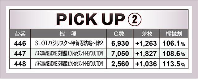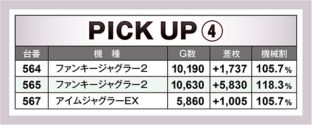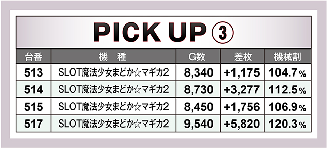 3台並び・4台並びで好結果を残したのが上記4箇所。1台を除いて5,000G以上回された上でのプラス記録である。ここに並んでいる台たちが優秀台だったのはほぼ間違いないだろう。4台中2台が3,000枚オーバーを達成した『SLOT魔法少女まどか☆マギカ2』、6,000枚近い記録を叩き出した『ファンキージャグラー2』の勢いには驚かざるを得ない。