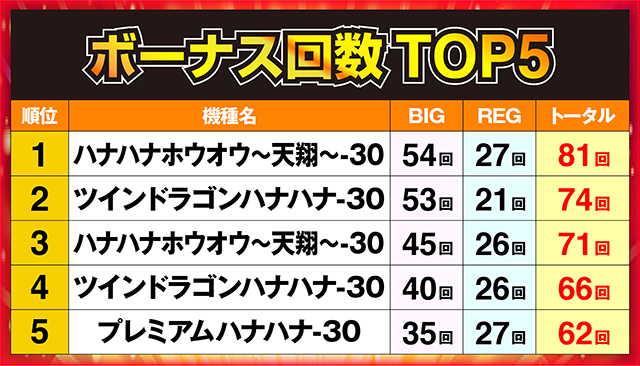 3台のうち2台が「ハナハナホウオウ~天翔~-30」であり、81回を記録した台が首位を獲得した。