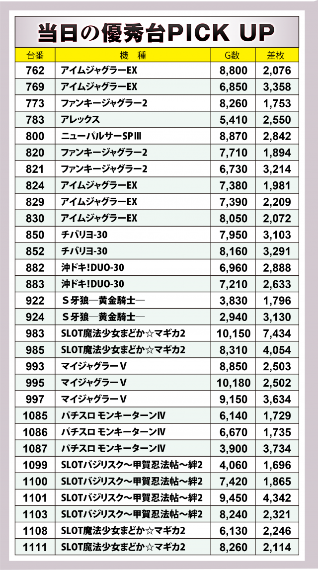 まずはパチスロ優秀30台をPICK UP。後述する横並び好況スポット以外では、写真で挙げた『SLOT魔法少女まどか☆マギカ2』がプラス4台トータルで+1万5千枚突破&7千枚を超えた台あり。さらには『チバリヨ-30』が2台、『パチスロ モンキーターンⅣ』が3台でそれぞれ+6千枚を超えた。