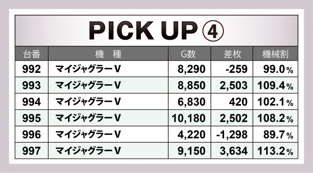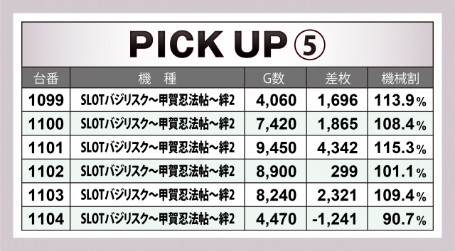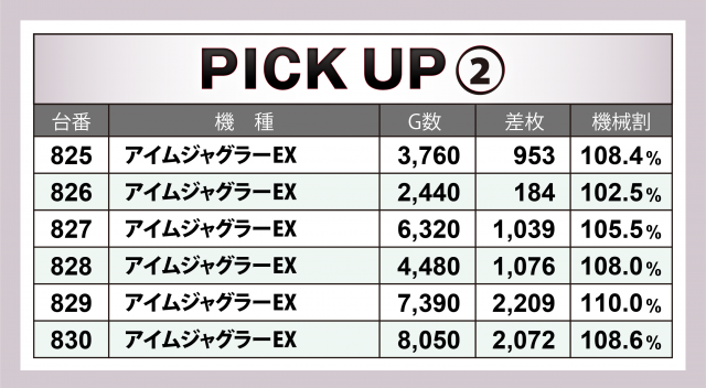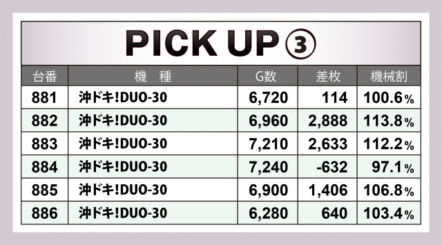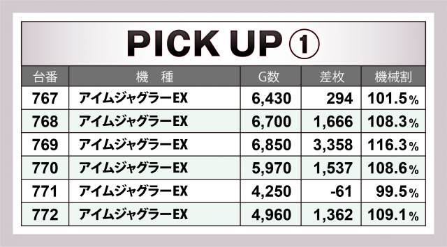 またこの日は4機種の横並び好況スポットが出現。それぞれ6台で残した記録は+9千枚強となった『SLOTバジリスク~甲賀忍法帖~絆2』、+7千枚強となった『沖ドキ!DUO-30』『マイジャグラーⅤ』、そして12台で+1万5千枚を超えたのが『アイムジャグラーEX』となった。