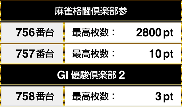 複数の機種を通してプラスptが並ぶ場所は、『麻雀格闘倶楽部参』と『GI優駿倶楽部2』にもあった。