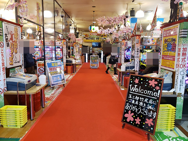 清潔かつ華やかな装飾に彩られた店内も印象的な「パチンコ玉三郎竹尾店」。