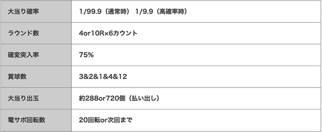 確変の消化スピードが特徴であり、ラウンド終了から次回の大当りまでにかかる時間は平均約46秒。
