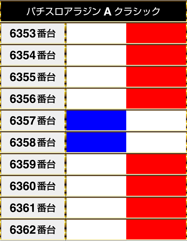 『パチスロアラジンAクラシック』の6353番台から6356番台、6359番台から6362番台までにプラスptが並ぶ!
