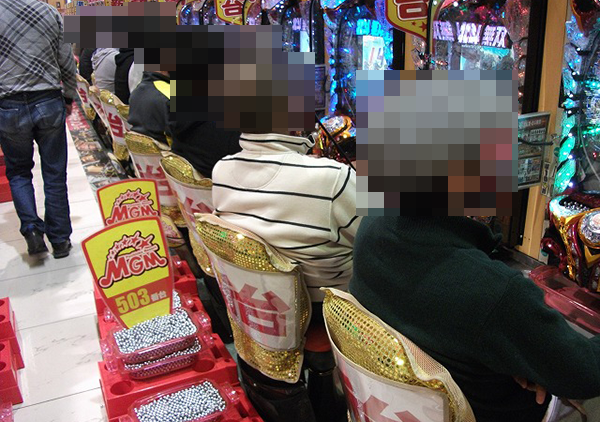 16時過ぎの4円パチンコでは、新台の「ぱちんこCR真・北斗無双」と「CR牙狼 魔戒ノ花」がほぼ満席。
