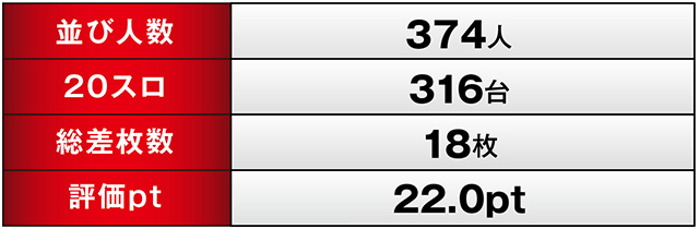 前回1月28日の朝は、303人が並ぶほどの大盛況!いかに地域の常連さん方に信頼されているかが窺える内容であった。そして今回、2月1日の朝の並び人数は、前回を優に上回る374人。おそらくは前回の好状況が口コミで広まっていたのだろう。その期待に応え、ギリギリではあるがトータル差枚はプラス値を実現していたぞ!