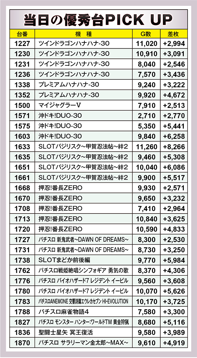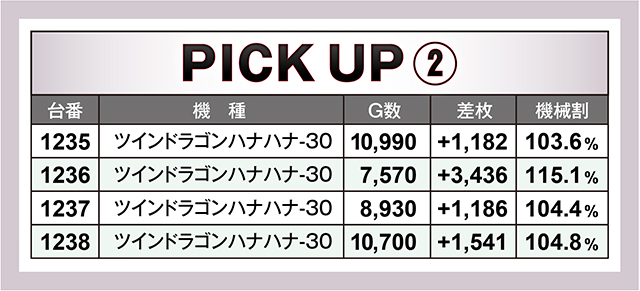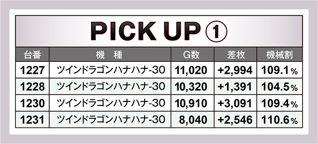 先述の通り、様々な機種から好結果が生まれていたが、その中でも特筆すべきは『ツインドラゴンハナハナ-30』だろう。なにしろ4台並び×2ヶ所で優秀台としか思えない光景が生まれていたからだ。その8台は全て+1,000枚以上の数値となっており、8台の平均差枚は+2,170枚に!