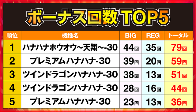 堂々の1位に輝いたのは、ボーナス回数79回を記録した「ハナハナホウオウ~天翔~-30」の1台であった。