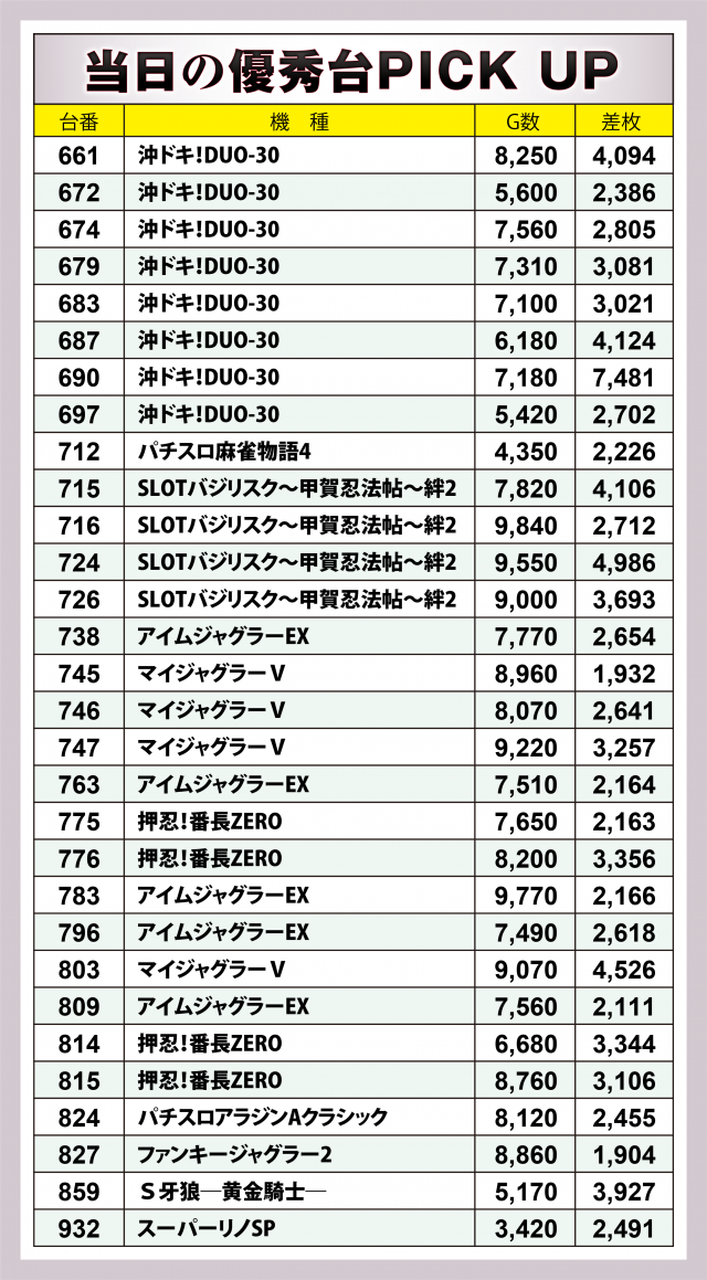 まずはこの日の優秀30台PICK UPから。差枚数をチェックすると、2台を除きその他全てが+2千枚オーバーを達成。後述する横並び好況スポット以外では、『沖ドキ!DUO-30』に好調台多数で最高で+7千枚超えを記録! その他でも+3千枚・4千枚クラスが容易に見られる状況だった。