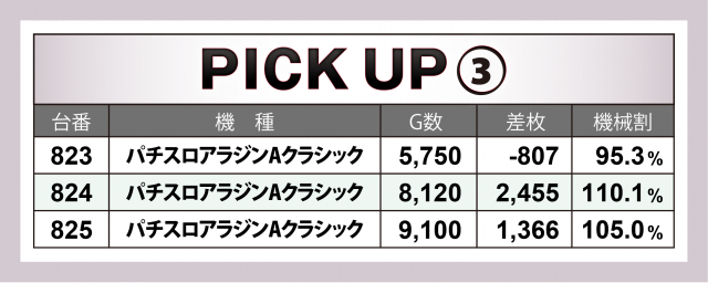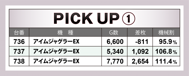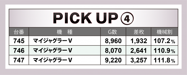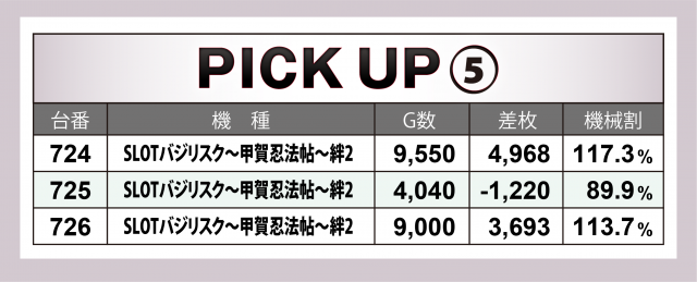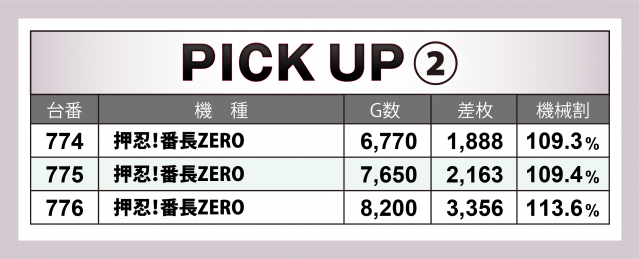 また、当日は5機種3台ずつの横並び好況スポットが出現。うち『押忍!番長ZERO』『マイジャグラーⅤ』『SLOTバジリスク~甲賀忍法帖~絆2』3機種が合計で+7千枚オーバーを達成し、着実な結果を残した。