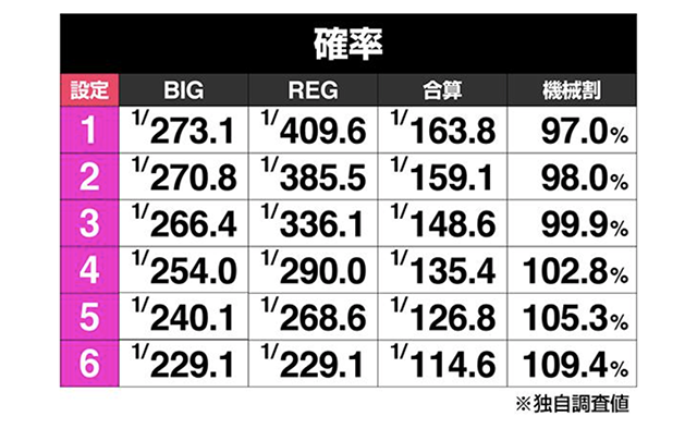 ボーナス確率に設定差が存在しており、とくにREG確率の差が大きい。