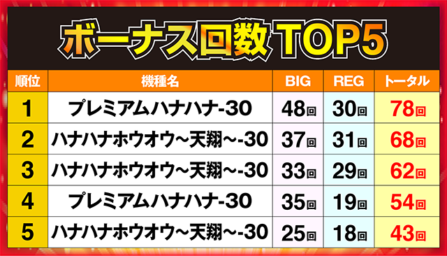 堂々の1位に輝いたのは、ボーナス回数78回を記録した「プレミアムハナハナ-30」!