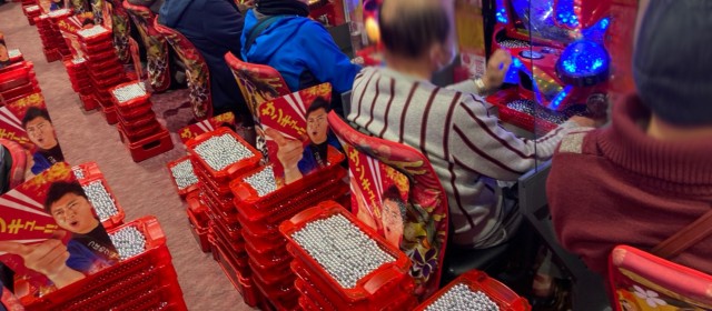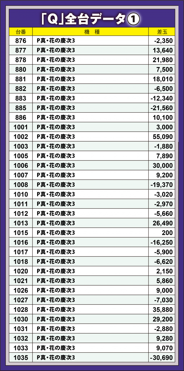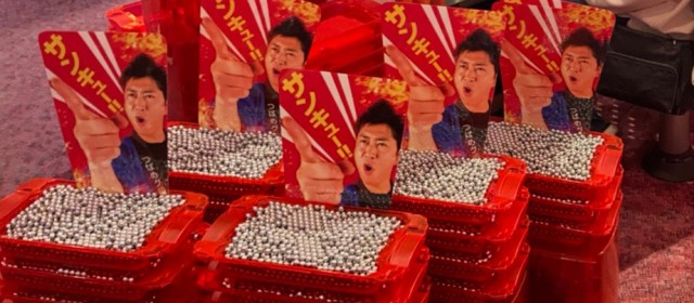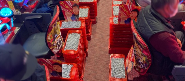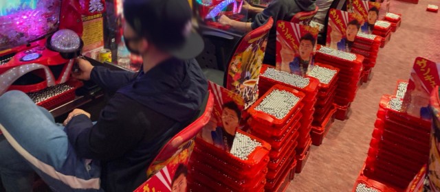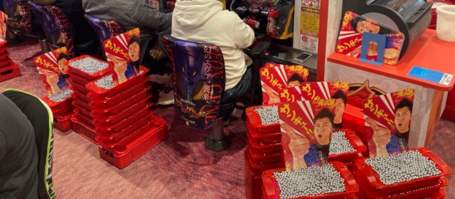この日の取材対象となったのは前回同様『P真・花の慶次3』34台。フル稼働と言ってもいいほど遊技客が粘る中、前回を超えられなかったものの出玉爆発、差玉トータルで+15万発超を達成! その他、+3万発超えが2台・+2万発超えが3台、また当機種の最高記録が+5万5千発オーバーと、こちらは前回を上回った。出玉の山に囲まれながらファンが集中して通常時回転を黙々と消化していたのが印象的だった。