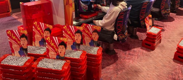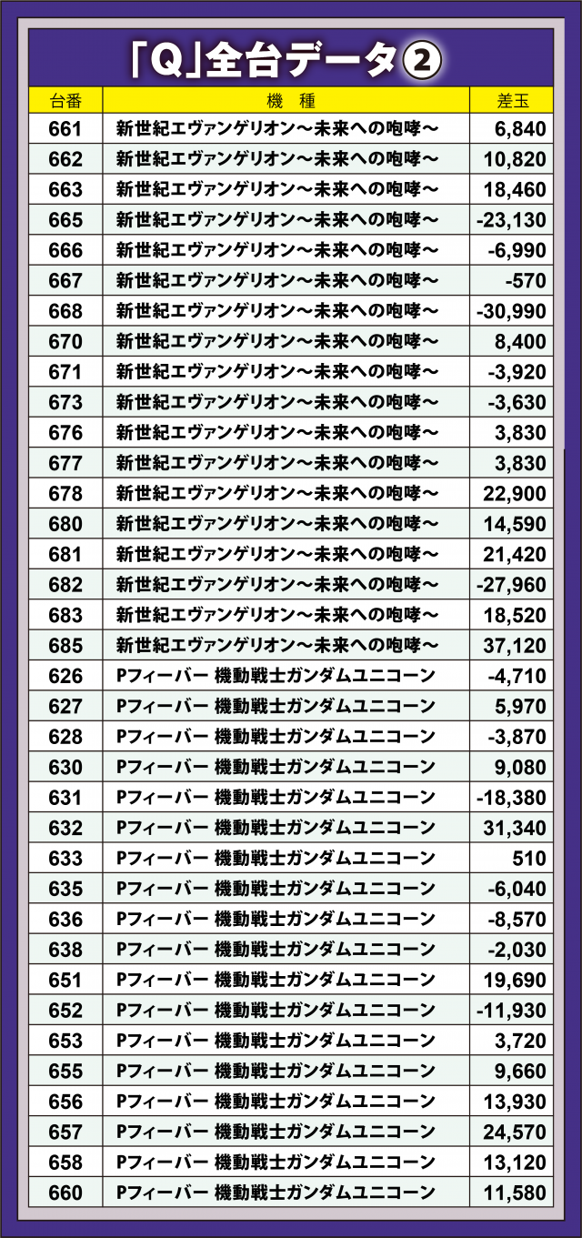 『真・慶次3』に負けず劣らずの出玉となったのが、こちらも前回好調&18台ずつの『新世紀エヴァンゲリオン〜未来への咆哮〜』『Pフィーバー 機動戦士ガンダムユニコーン』。どちらも+3万発超えを1台ずつ輩出、36台の平均差玉は+4千3百発を超え、『真・慶次3』に迫る勢いとなり、プレイヤーが上気しながらデジタル回転をこなしていた。