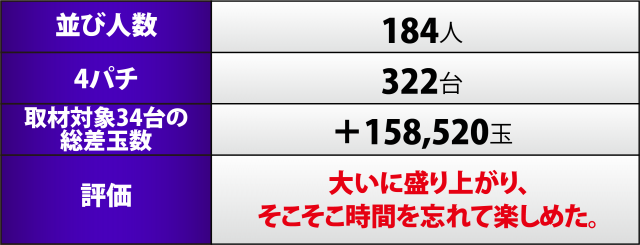 今回、4パチ対象34台は+158,520発と爆発、上に挙げた4機種の合計で+45万発近い超大量出玉を成し遂げた。前回に続いてパチンコ単独の取材で連勝、しかも驚きの出玉を量産しており、高い実績を残しているのが素晴らしい。やはり存在を見逃してはならない注目店だ。