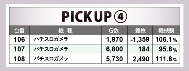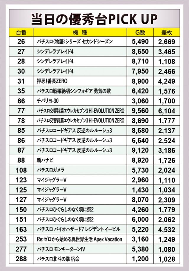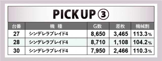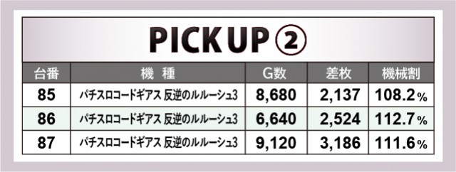 特筆すべき3機種の平均差枚数と平均機械割は上記の通り。多種多様な機種が取り揃えられている同店だが、これほどに優秀台だと認識できる数字は他にない。コンスタントな初当りの獲得、そしてAT完走のチャンスを掴むなど、遊技をしていたファンは有意義なひと時を過ごしていたのではないだろうか。