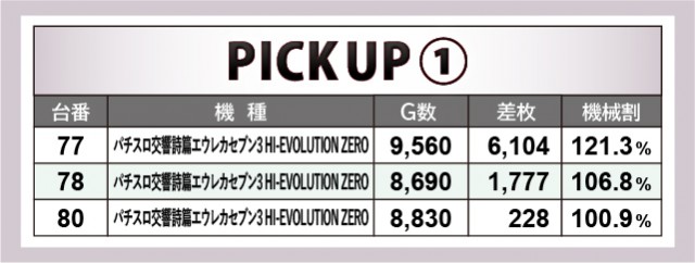 兵庫県尼崎市にて、スロット専門店として営業している「メトログラッチェ3号店」。上表をご覧の通り、機種ごとに目立った活躍が見られるのが大きな特徴だ。この日の最高差枚数+6,104枚を記録した『パチスロ交響詩篇エウレカセブン3 HI-EVOLUTION ZERO』を筆頭に、『パチスロコードギアス 反逆のルルーシュ3』や『シンデレラブレイド4』など、平均差枚数から優秀台の存在を確信できる。