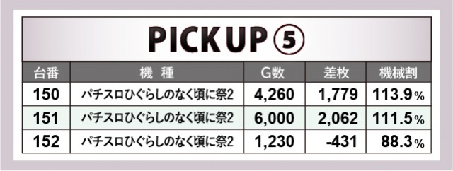『パチスロガメラ』と『パチスロひぐらしのなく頃に祭2』もまた、優秀台が並び立っていた機種群だった。全台プラス差枚とはならなかったものの、その数字を見れば、展開に恵まれなかった様子を想像できる。特に『パチスロひぐらしのなく頃に祭2』のプラス台は機械割110%を超える数字となっており、こちらでも充実のスロットライフを送れたはずだ。