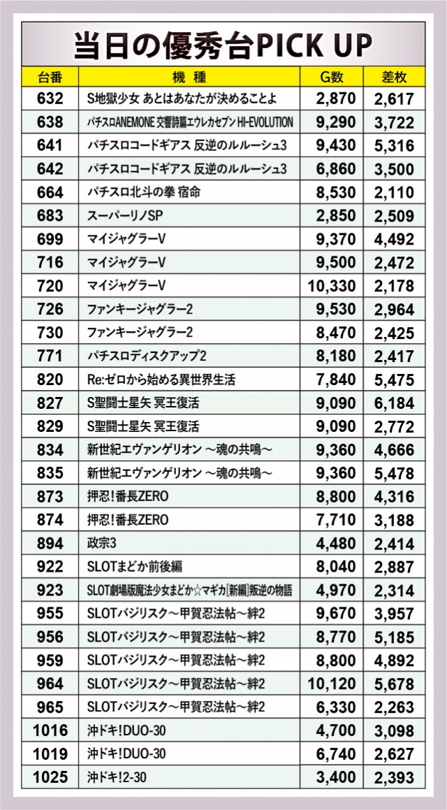 30台の優秀台をピックアップしてみると、いずれも2千枚オーバーを達成している。『パチスロコードギアス 反逆のルルーシュ3』『Re:ゼロから始める異世界生活』『S聖闘士星矢 冥王復活』などから5千枚オーバーが発生!他機種でも3千枚オーバーが続出し、頭上にドル箱の山々が形成される光景には、誰もが息を吞んでしまうだろう。