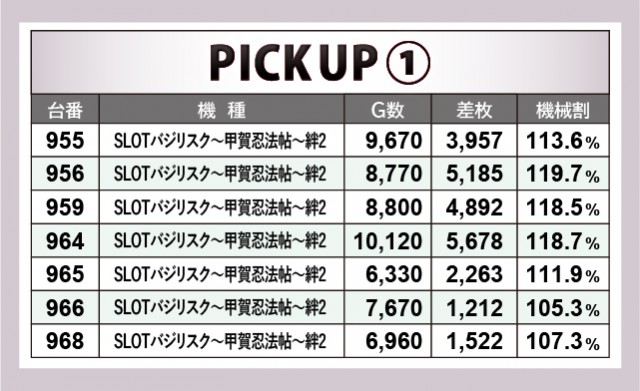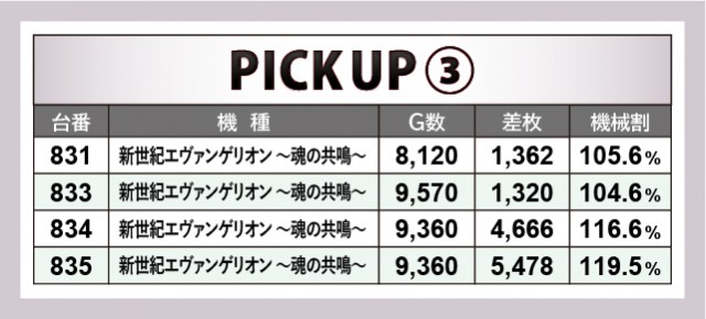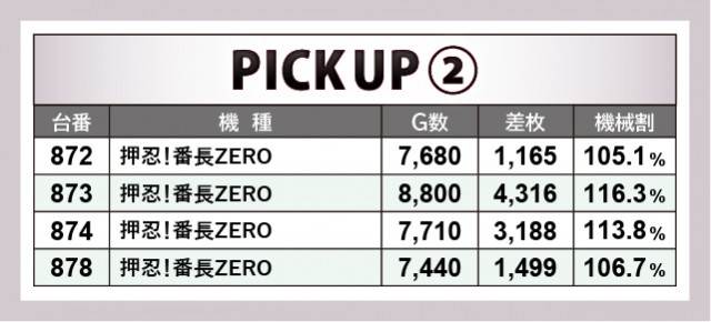 『SLOTバジリスク~甲賀忍法帖~絆2』では、964番台の+5,678枚・956番台の+5,185枚・959番台の+4,892枚が活気を見せていた。導入されて以来、ホールの盛り上がりをけん引している機種だけに、今回の結果は文句なしだろう。また『押忍!番長ZERO』『新世紀エヴァンゲリオン 〜魂の共鳴〜』も同様に、4~5千枚オーバーが発生していた。どちらもファンからの支持が高いシリーズ機で、しっかりと期待に応えてくれた。