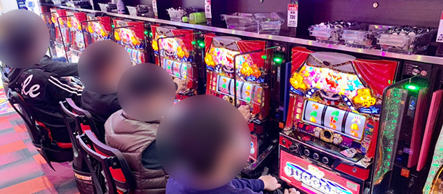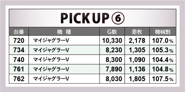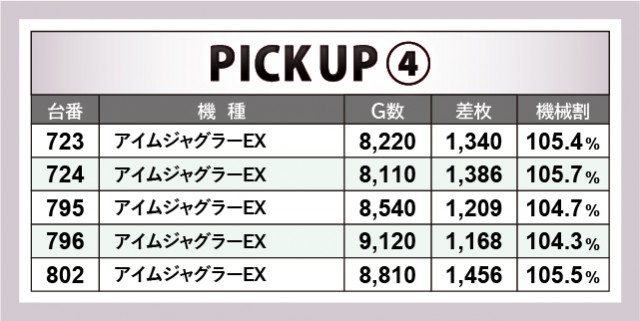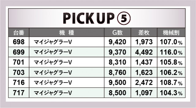 『アイムジャグラーEX』は安定した数字でプラス差枚数を記録。そしてシリーズの中でも人気が高い『マイジャグラーV』では699番台の4,492枚が飛び出すなど、圧巻の数字を残す台も見られた。両機種とも8,000回転超えが目立っており、誰もが手ごたえを感じながら楽しんでいたに違いない。