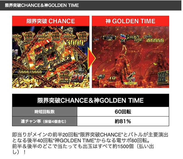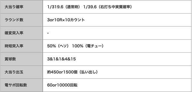 初回の時短付き大当りは10R+時短10000回転となっており、実質約3000個(払い出し)の出玉を獲得した状態で連チャンゾーンを楽しめる。