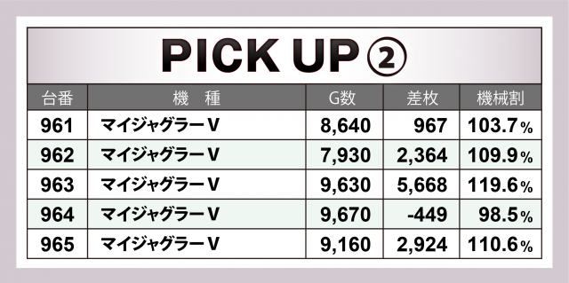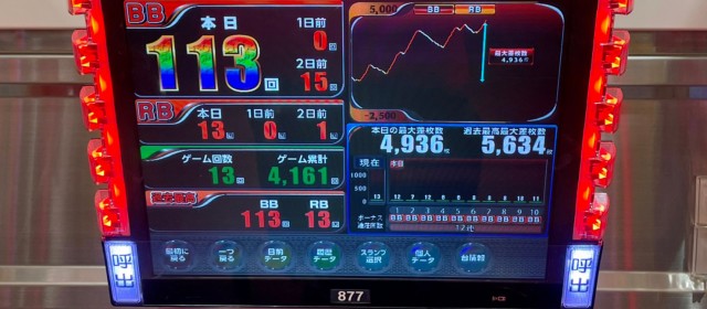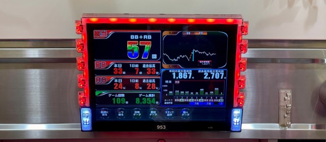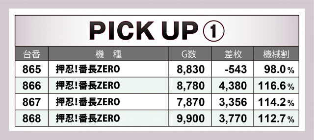 またこの日は『押忍!番長ZERO』『マイジャグラーⅤ』の2機種が横並びで好調。その差枚数は、前者が4台トータルで+1万枚超え、後者は10台の合計で+2万5千枚を突破!
