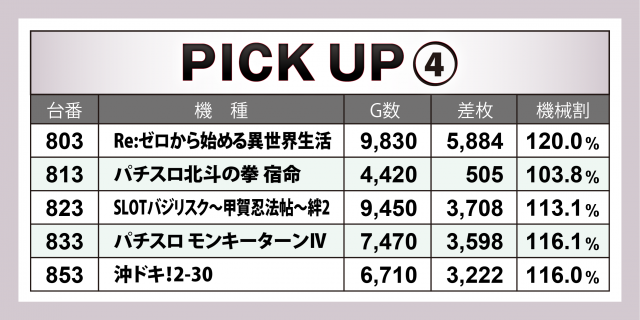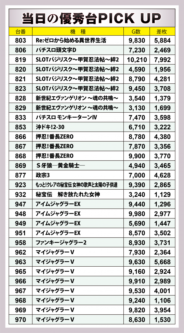 まずはこの日の優秀30台のPICK UPから見ていこう。後述する好況スポット以外で、特に優秀な差枚数を残したのが『SLOTバジリスク~甲賀忍法帖~絆2』と『政宗3』。前者は+4千枚突破&+8千枚弱の台が、後者は+4千枚超えの台がそれぞれ出現!