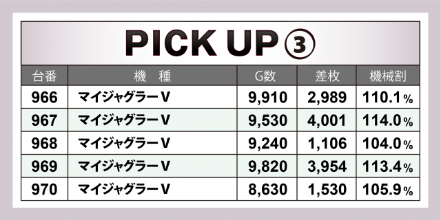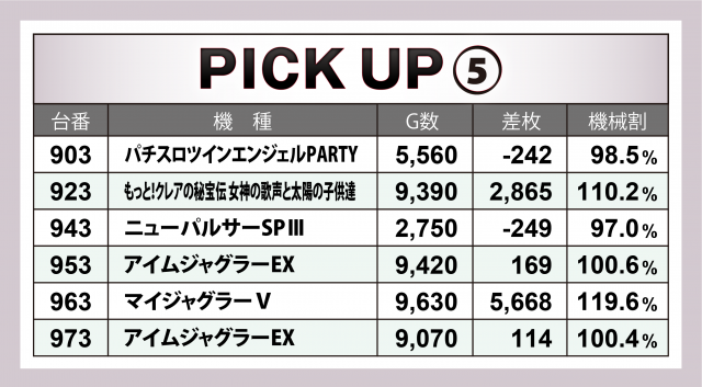 さらに、末尾3の台番の機種が軒並み好調となる結果に。計11台のプラス率は8割超&+5千枚を超えた機種が2台となった。