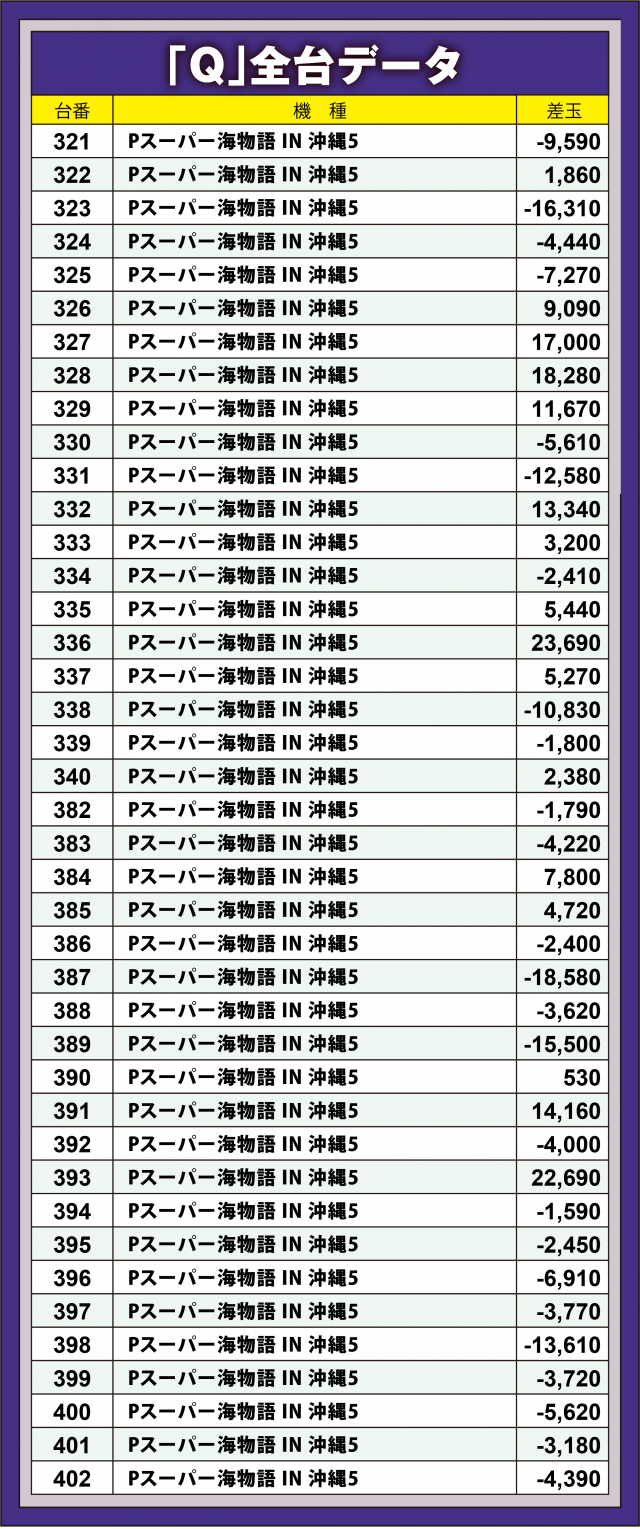 「Q」が姿を現す中、今回の4パチでは前回と同じく『Pスーパー海物語 IN 沖縄5』41台が取材対象に。しかし、これまた前回同様差玉数トータルでは残念ながら僅かにプラスに届かず。+2万発超えが2台ありトータルでも勝ちが見えたが惜しい結果に。ただし、着席していたファンが夢中で通常時回転をこなしていたことが印象的だった。