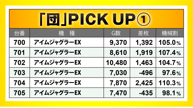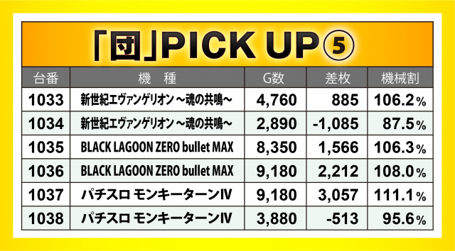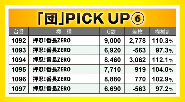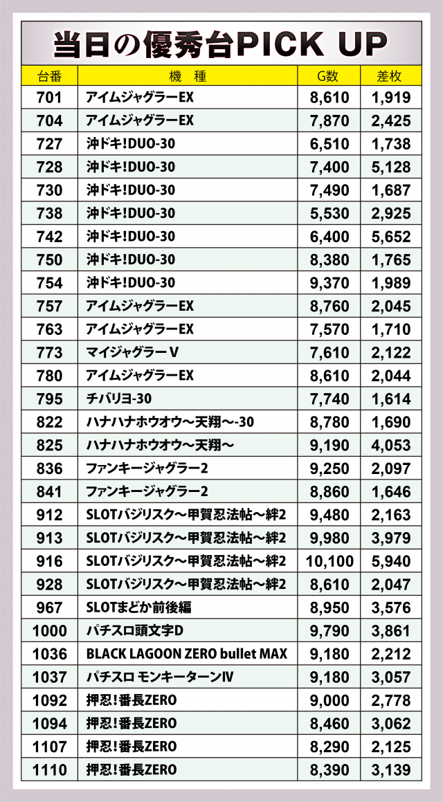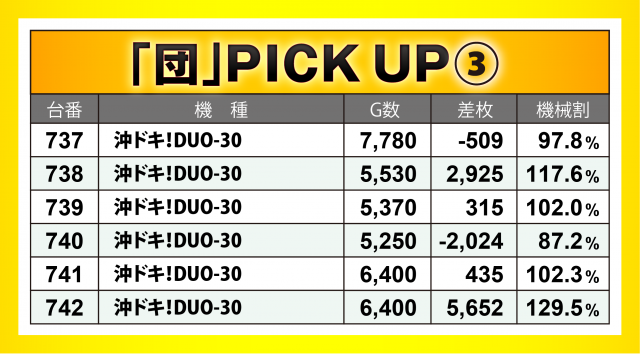 またこの日は「団」が熱視線を送る中、6か所7機種36台の横並び好況スポットが出現。その中でも『SLOTバジリスク~甲賀忍法帖~絆2』が最も好成績で、差枚数+6千枚弱の台を筆頭に6台トータルで+1万5千枚突破!! その他『沖ドキ!DUO-30』でも+5千枚超えの台あり!