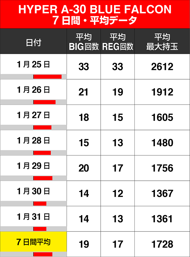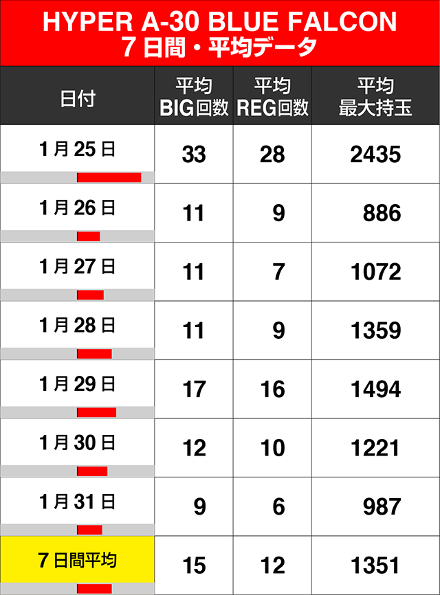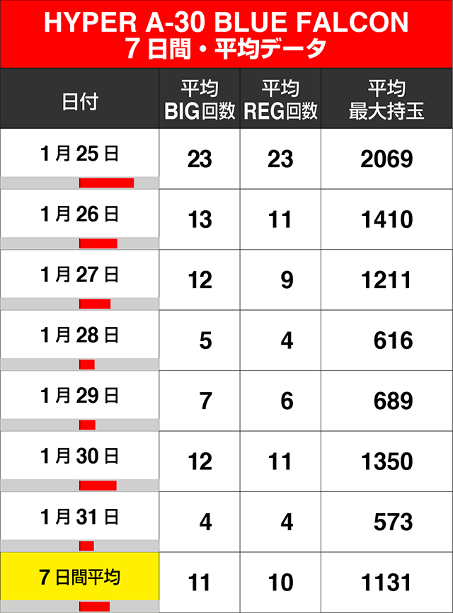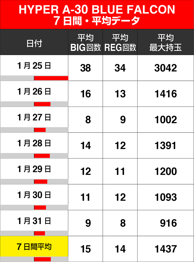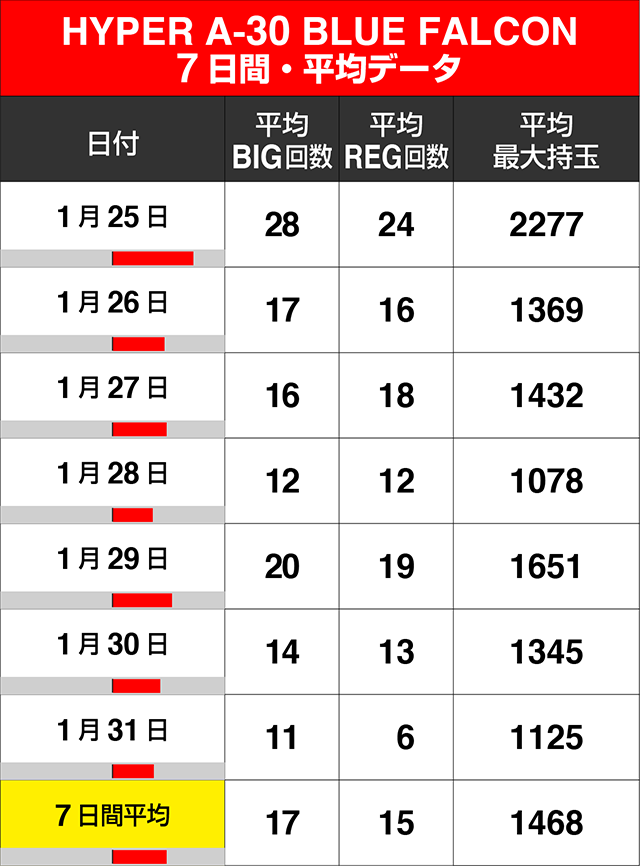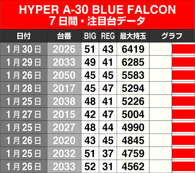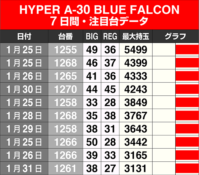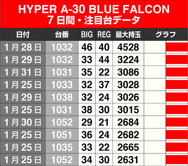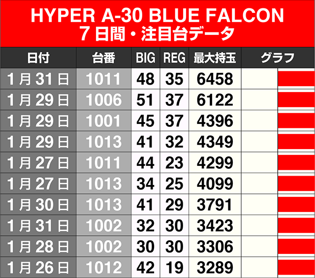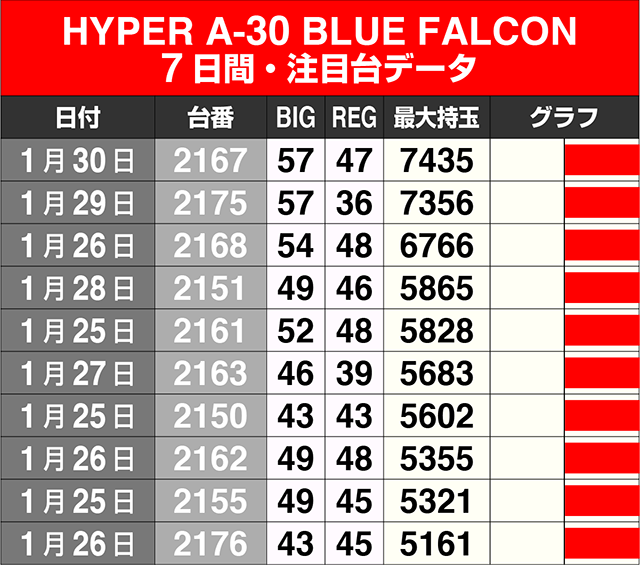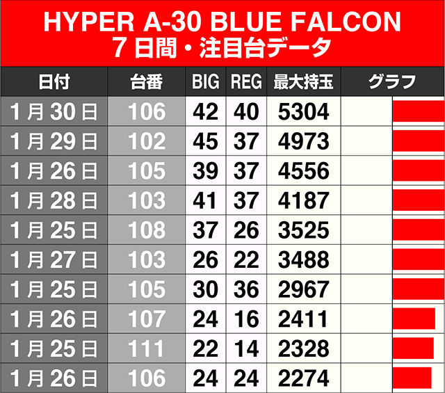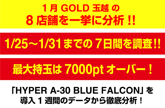 本州ではGOLD玉越グループのみ、それ以外は沖縄県に1店舗だけ導入されている「HYPER A-30 BLUE FALCON」の平均データと好調台をもとに、各店舗の状況を探っていく。