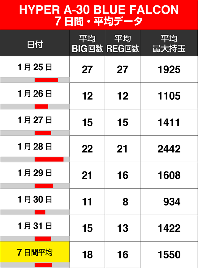 1月25日がもっとも好調で、機種全体の平均最大持玉は2,612pt!