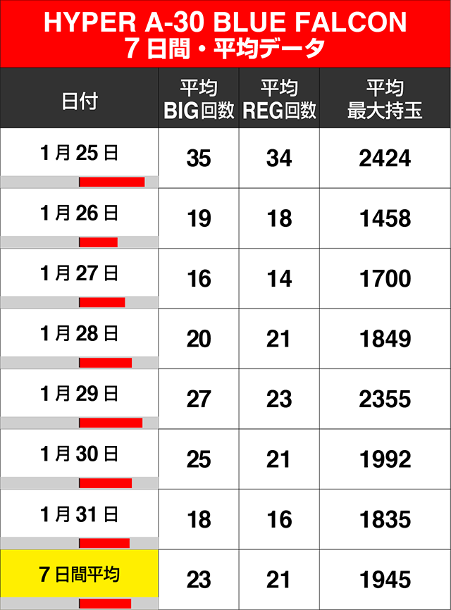 1月25日の平均ボーナス回数は、BIGとREGがともに23回!