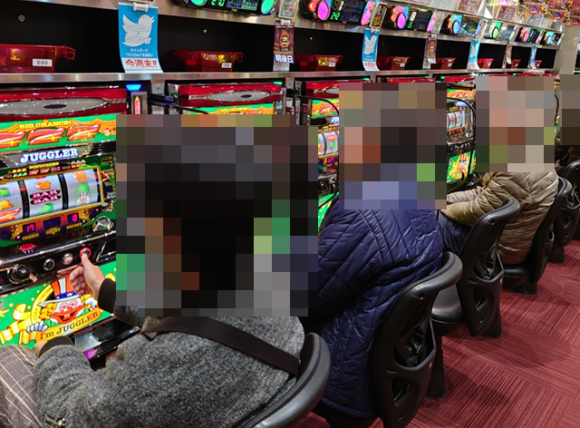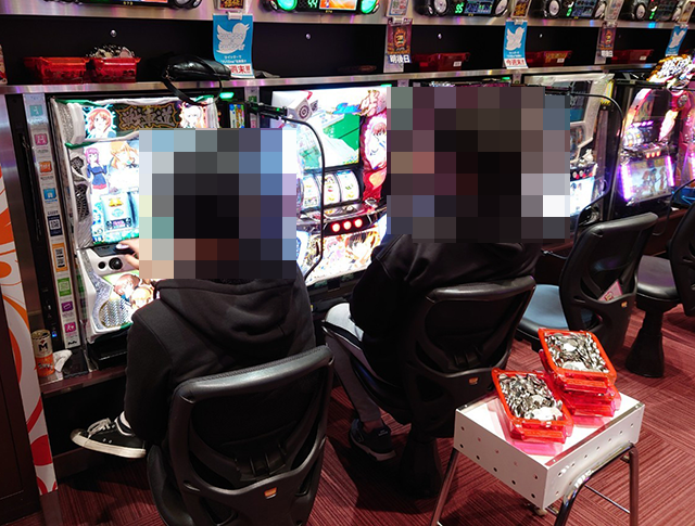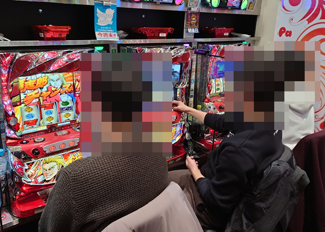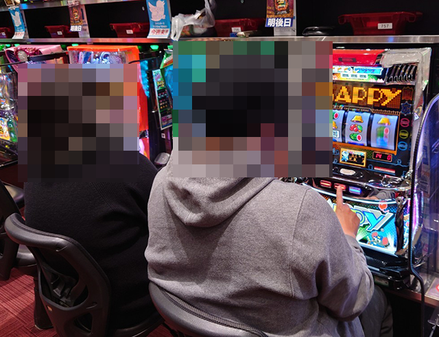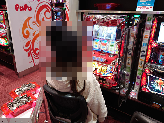 パチスロコーナーをまわっていると、笑顔で遊技をおこなっている姿が目に入ってきた。