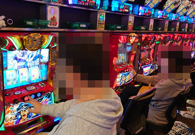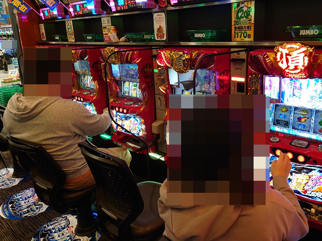 パチスロを中心に店内は活気づいており、さまざまな機種に笑顔が咲き誇っていた。