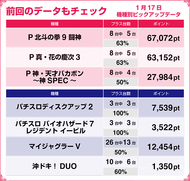 『沖ドキ!DUO』も半数以上がプラスで、どちらの機種もトータル差枚数は+10,000ptを超えた。