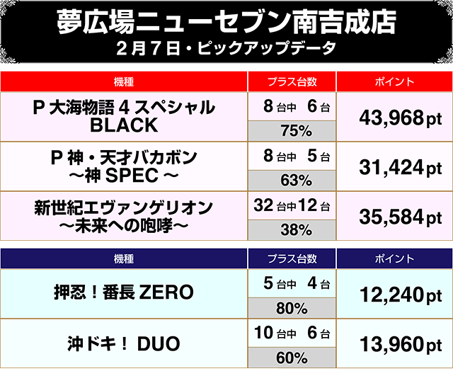 『P神・天才バカボン~神SPEC~』や『P大海物語4スペシャルBLACK』も+30,000ptオーバーと、幅広いスペックの機種の活躍が目立った。