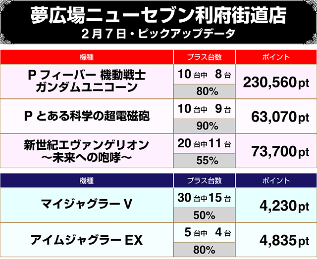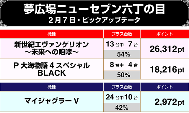 『新世紀エヴァンゲリオン~未来への咆哮~』は13台中7台がプラスで、トータル差玉は+26,312pt!!
