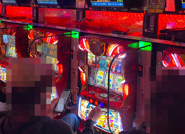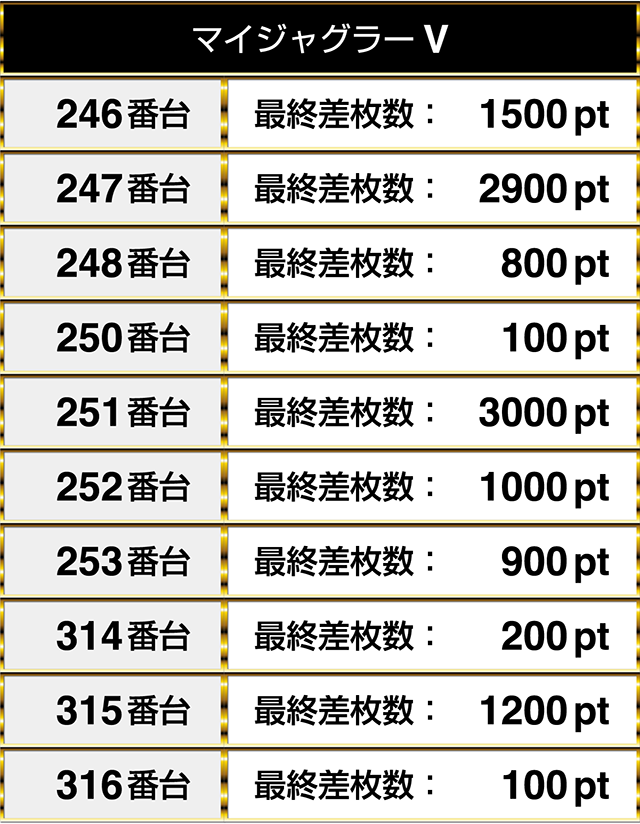 『マイジャグラーV』の3箇所に3台以上の並びでプラスptとなる場所があり、1台は3000pt!