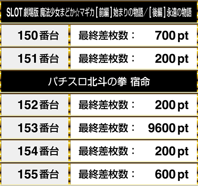 閉店時には150番台から155番台までの6台が並んでプラスptを記録!!