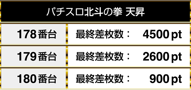 4台設置の『パチスロ北斗の拳 天昇』に4500pt、2600pt、900ptが並ぶ!!