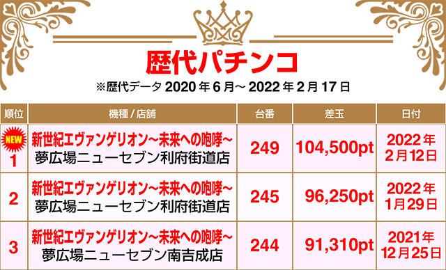 歴代トップとなる差玉100,000ptオーバーが、『新世紀エヴァンゲリオン~未来への咆哮~』にて記録された。