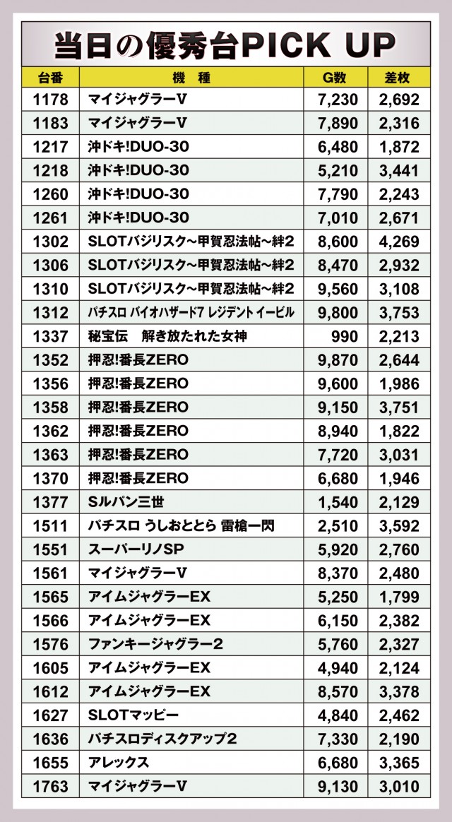 前回、前々回もそうであったが、「沖ドキ!」シリーズ以外の多台数設置機種も抜かりない。『押忍!番長ZERO』『SLOTバジリスク~甲賀忍法帖~絆2』『マイジャグラーⅤ』『アイムジャグラーEX』などの人気機種から高設定と思わしき差枚数の台が多数! しかも終日回されていた台が多かったので、確信を持ってプレイした方が少なからずいたのではないだろうか。