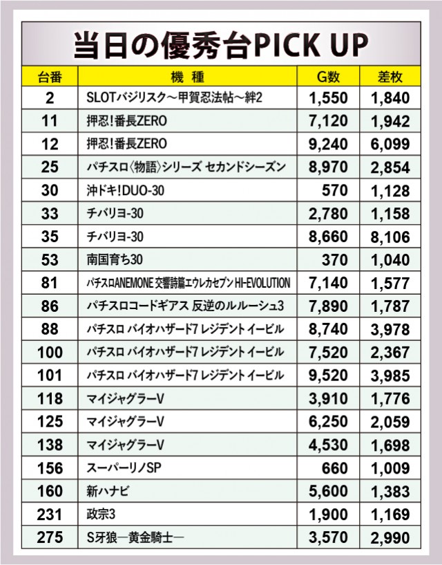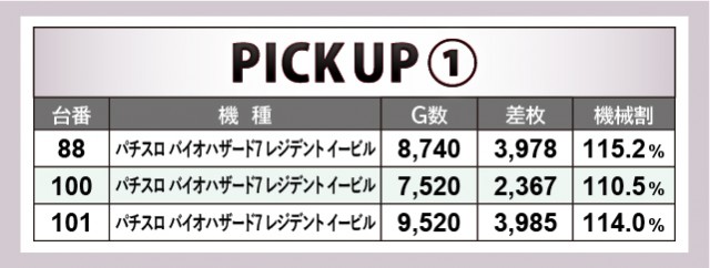 より詳細に迫っていくと、『パチスロ バイオハザード7 レジデント イービル』では全台プラス差枚を達成する好状況となった。全台で2千枚OVERを記録し、内2台は4千枚に迫る勢いを披露。また『押忍!番長ZERO』も同様に目覚ましい活躍を見せており、両機種が盛り上がりをけん引していたと言って過言ではない。