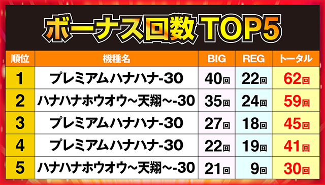 1位の座を掴んだのは、ボーナス回数62回を記録した台であった。