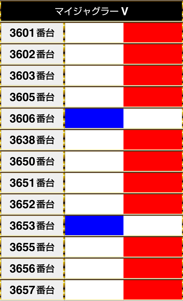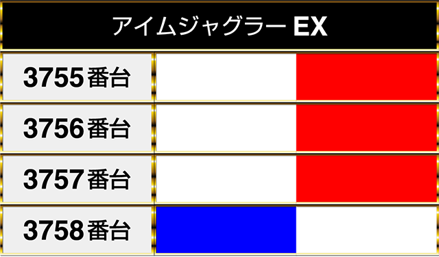 『アイムジャグラーEX』の3755番台から3757番台までが並んでプラスptを記録!!
